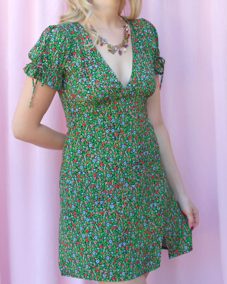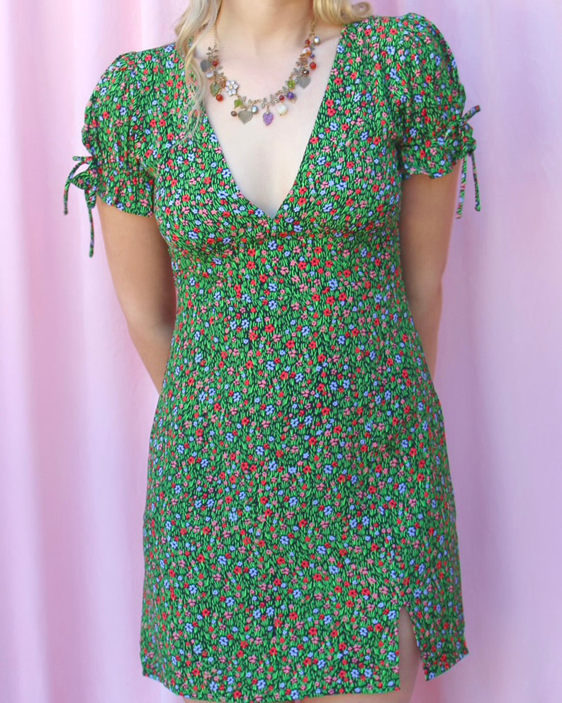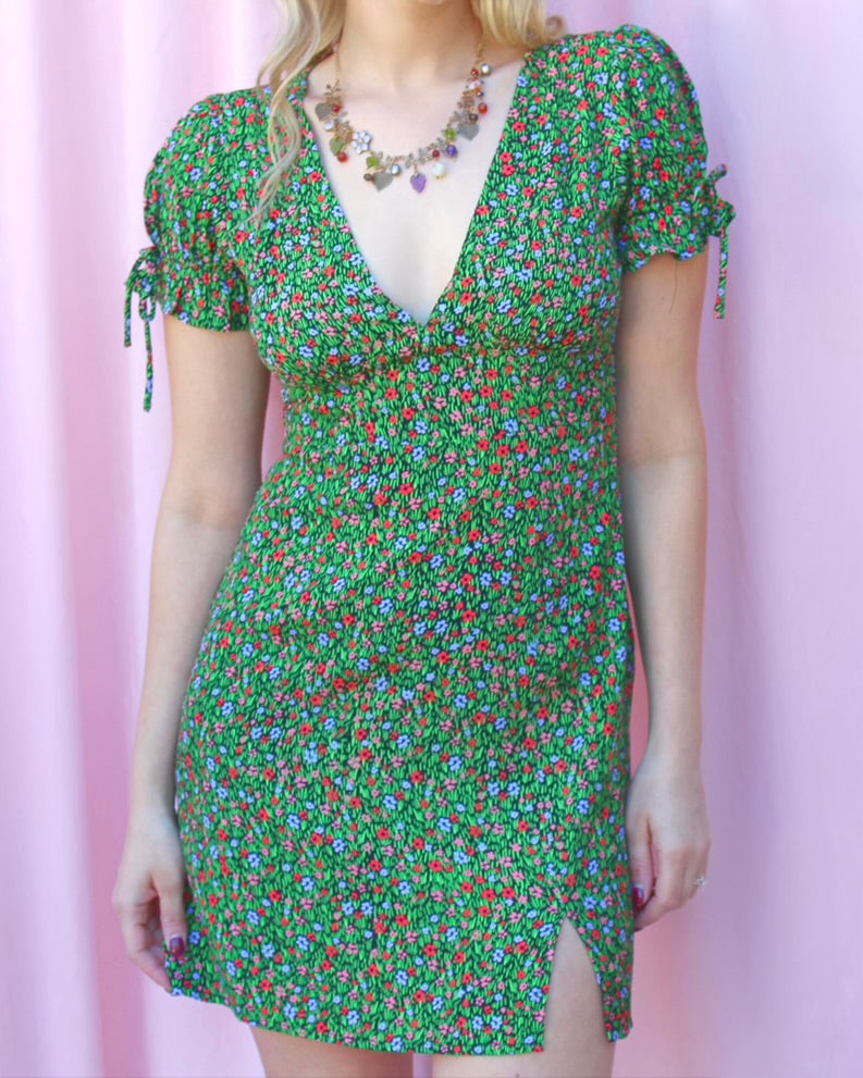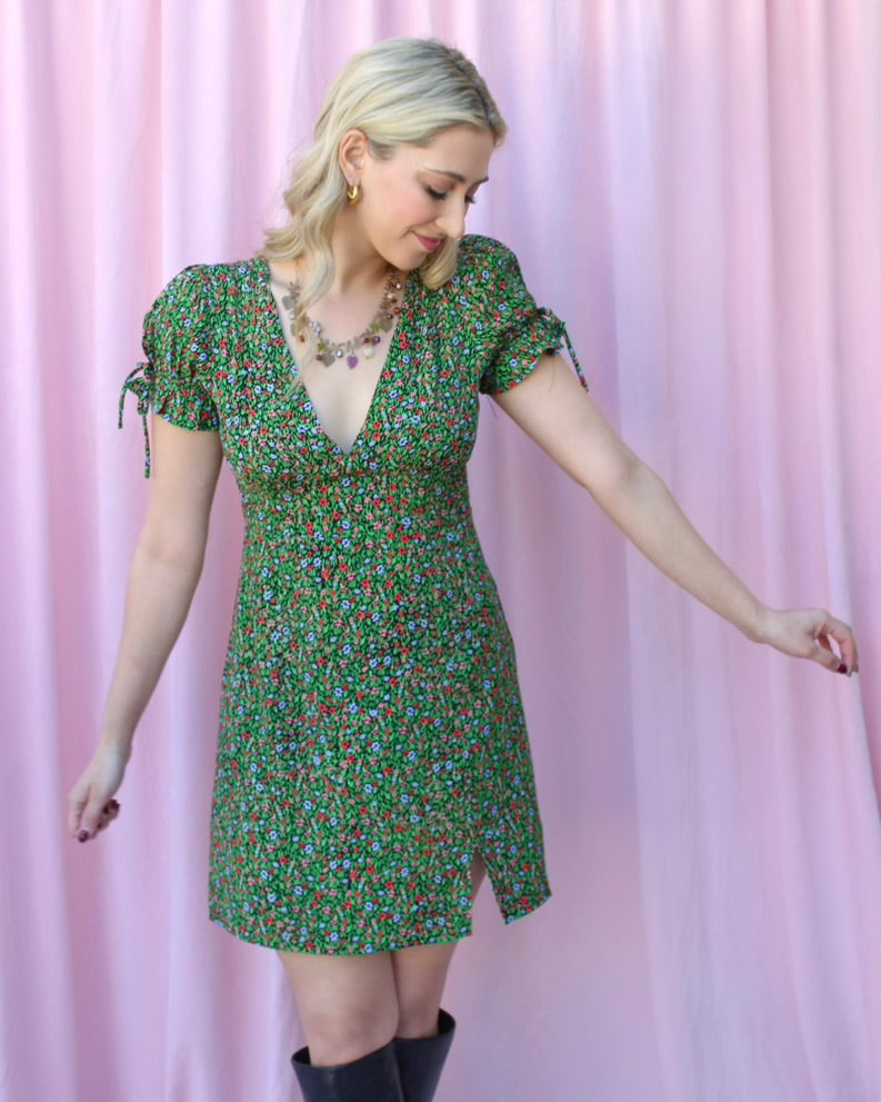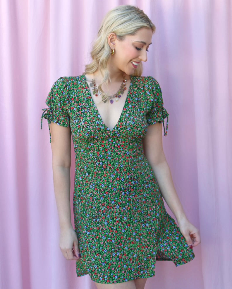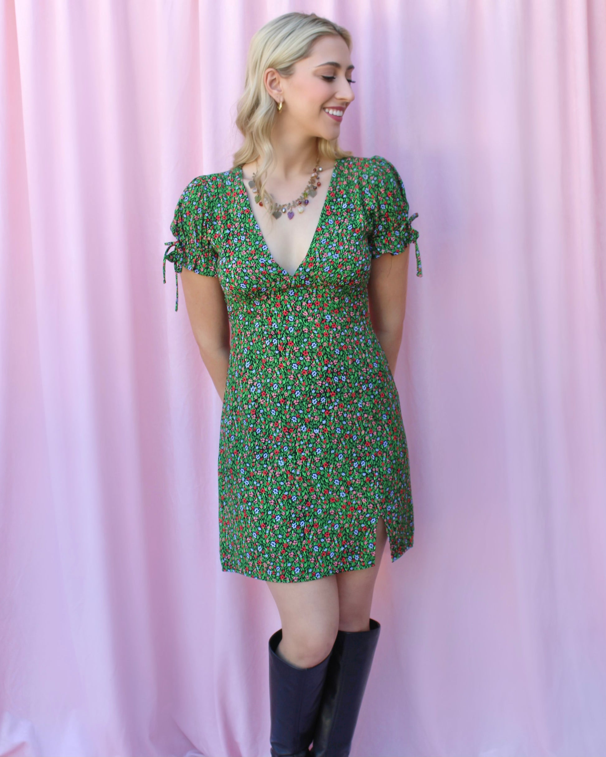 The Ainsley dress is cute and comfy! It is a basic a-line dress with a small slit on the side at the bottom. It features a lovely floral pattern and a deep v neckline. We love it in the spring with black and green shoes OR layer it in the fall winter with a black turtleneck sweater, tights, and boots.