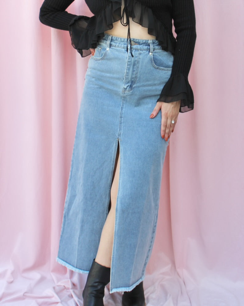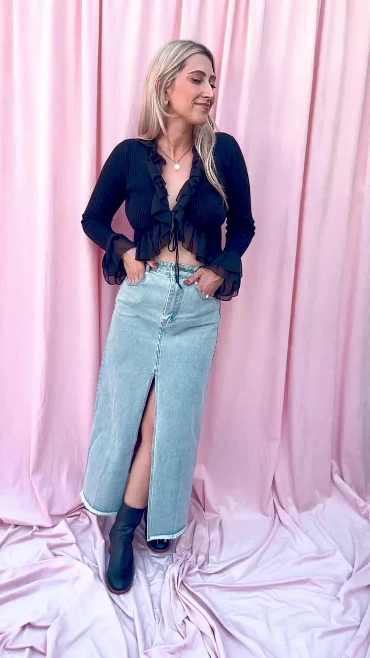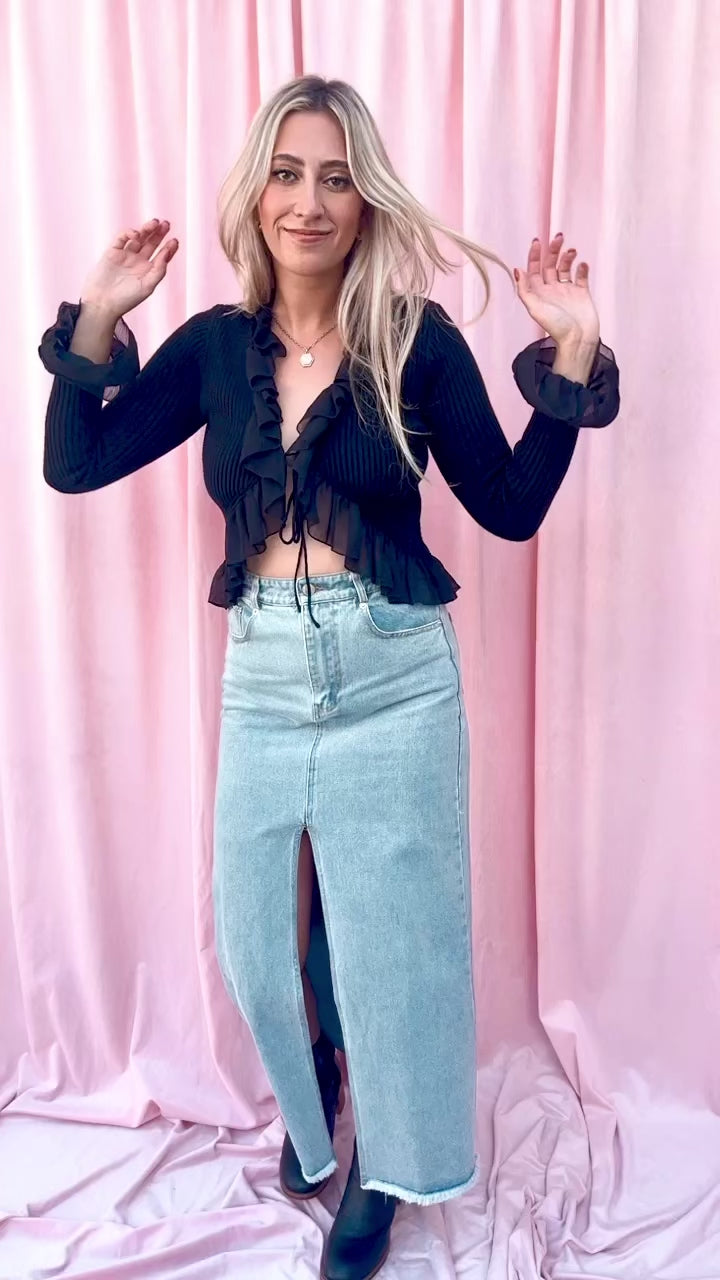 The Amelia denim high-waisted midi skirt is a trending little number! We are in love with denim midi skirts right now, they are all the rage! Pair it with our Fearless Ruffle Ribbed Long-Sleeve Black Top or your favorite t-shirt.