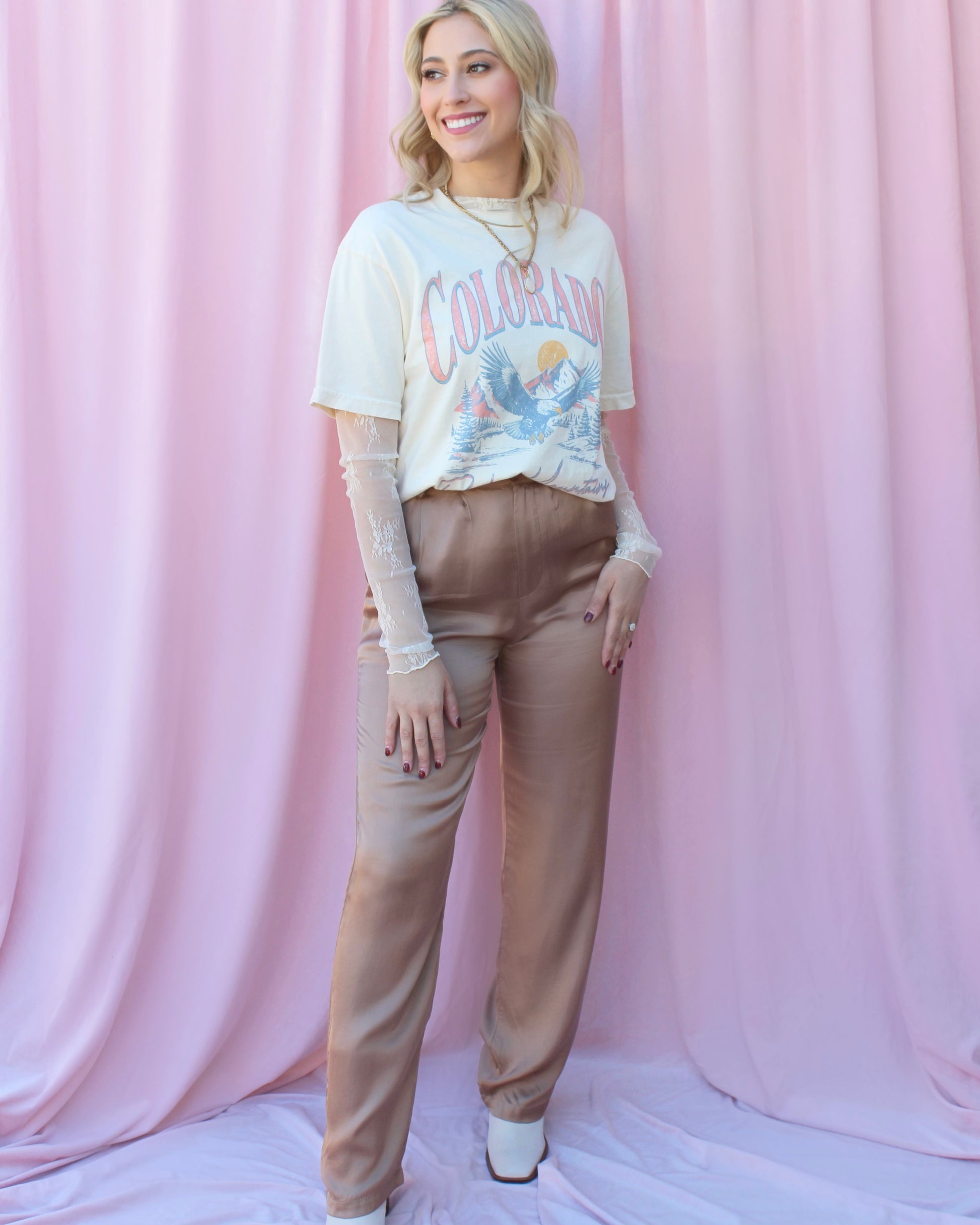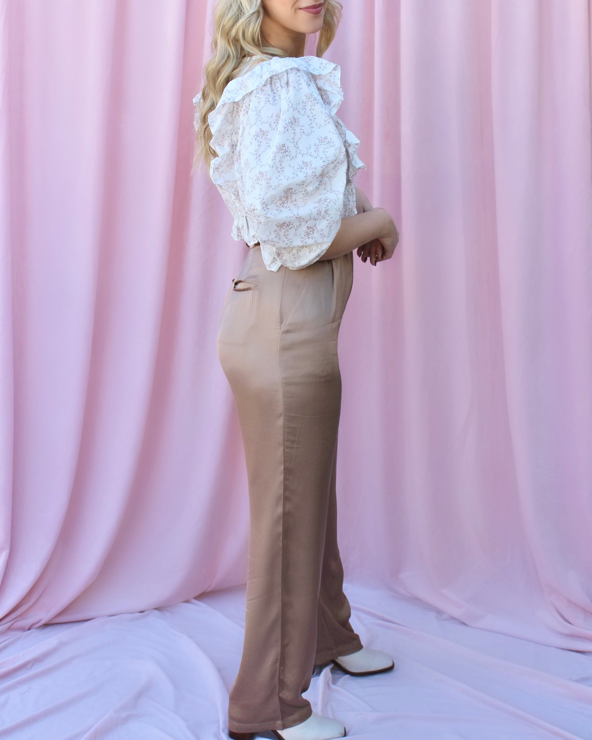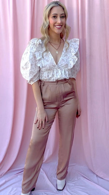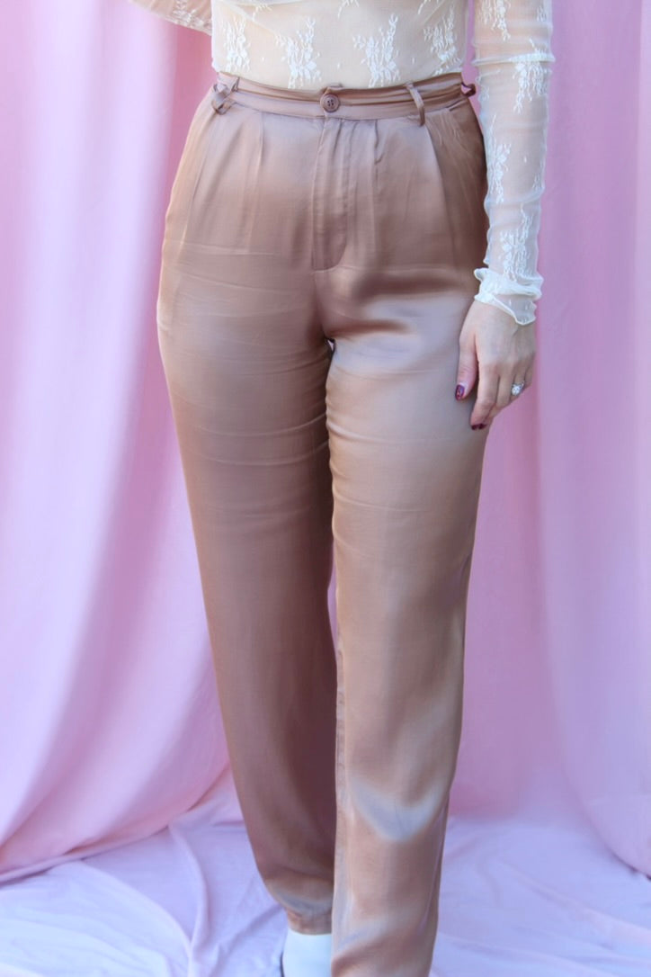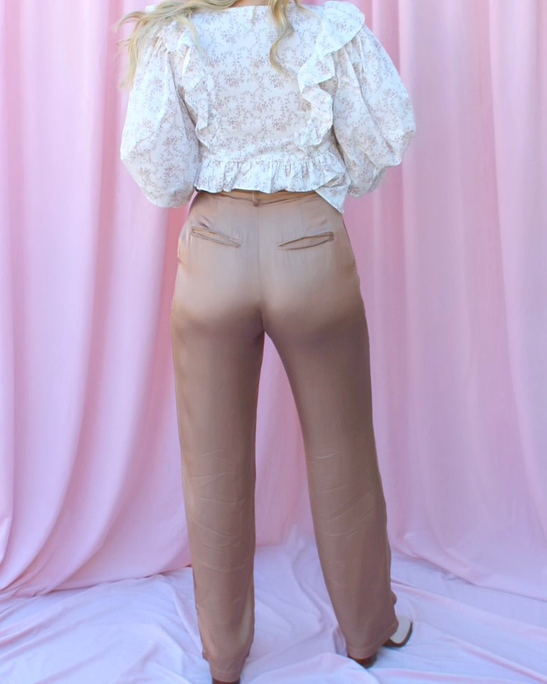The Celine high-waisted trousers are absolutely stunning and feel incredible on! They feature a button closure with pockets and an incredible satin-like texture. Wear them with t-shirts, blouses, corsets, literally ANYTHING!