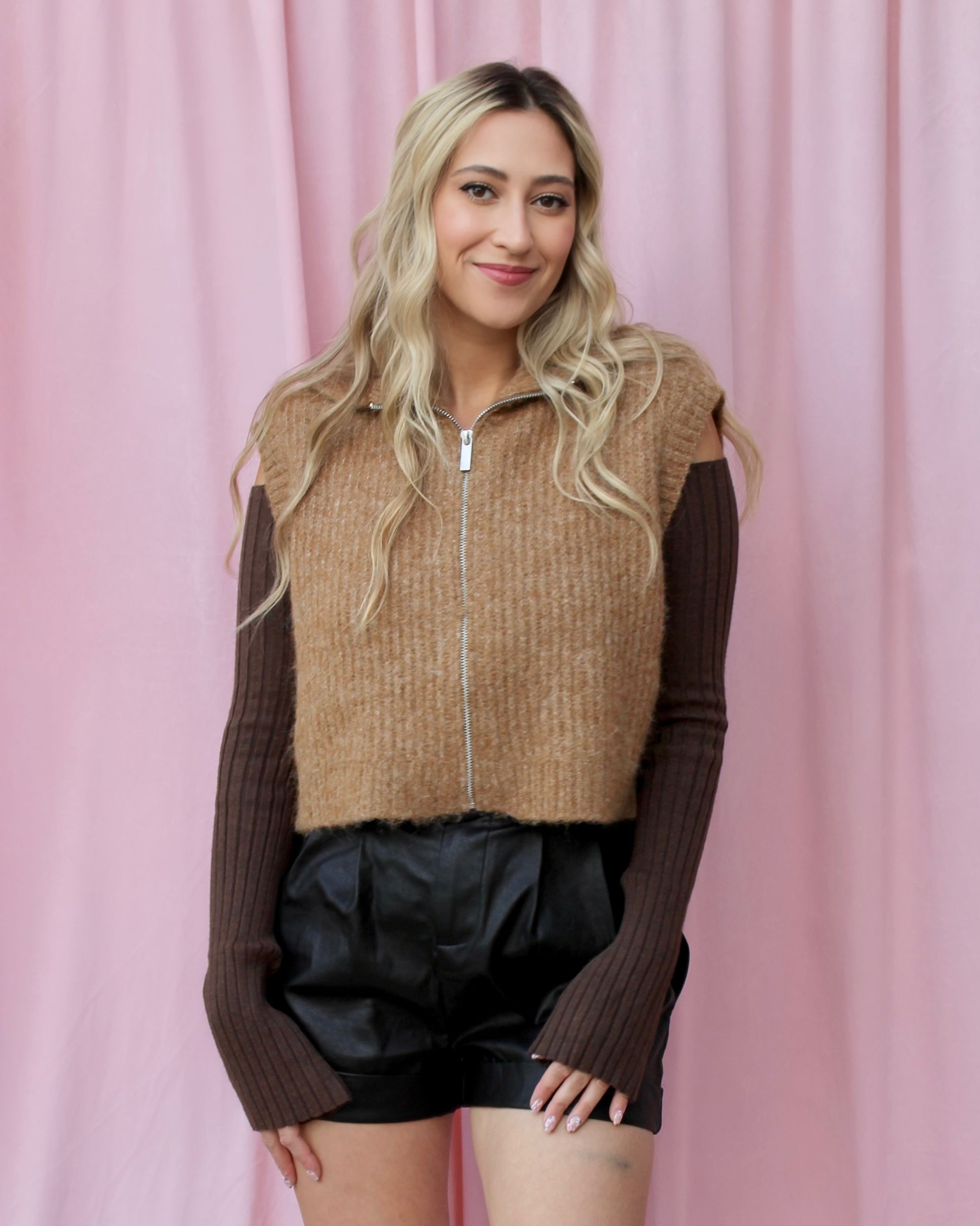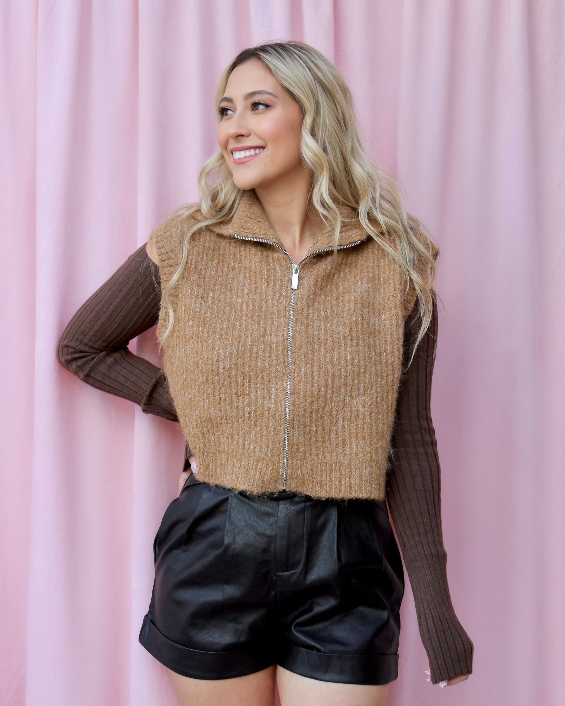 CHESNUT CROPPED CHUNKY KNIT ZIP-UP SWEATER VEST