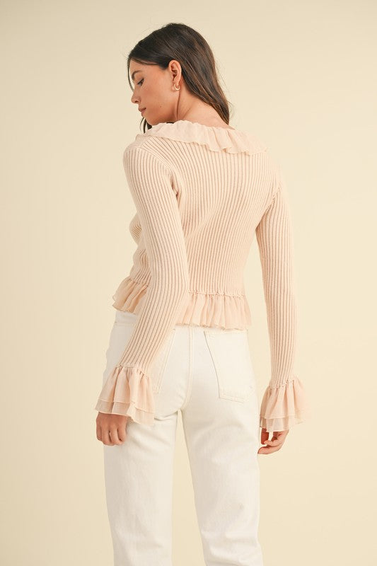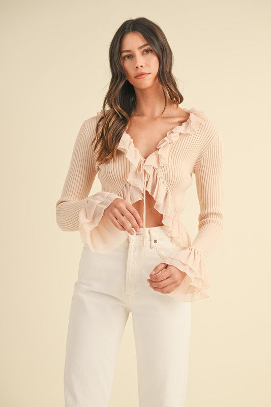 FEARLESS TAUPE RUFFLED RIBBED LONG-SLEEVE TIE-FRONT TOP