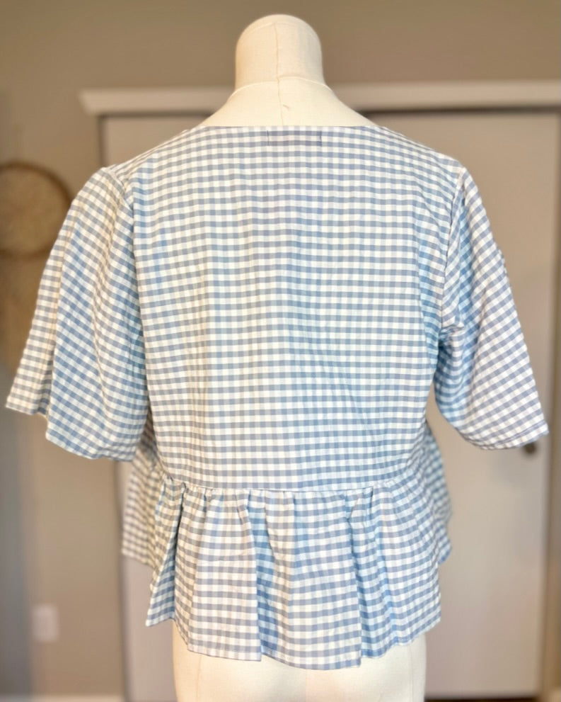 HAND-SEWN BLUE GINGHAM PEPLUM TOP WITH BOWS