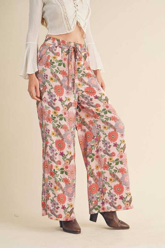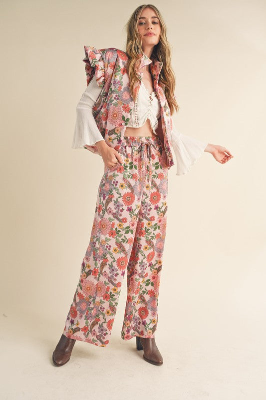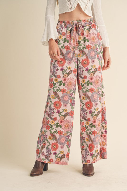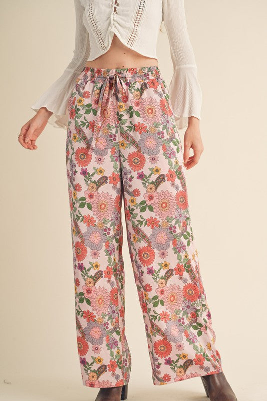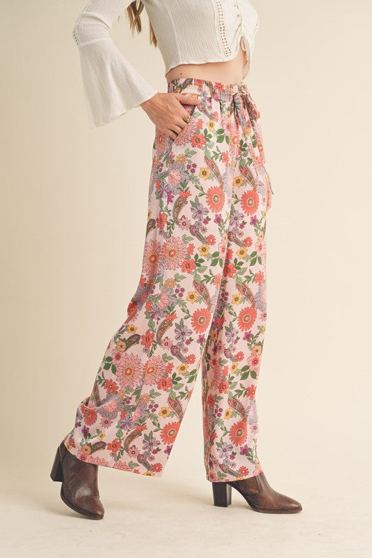 VENUS PINK FLORAL SATIN HIGH-WAISTED PANTS